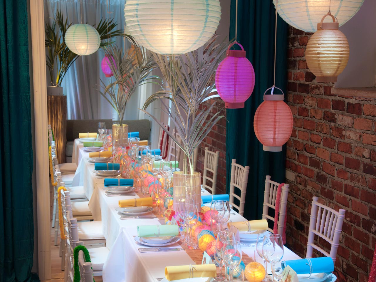 Upplyst palm-vas, lampor och lyktor, bambu-löpare, lösa blommor på borden, palm och färgglada servetter är inhyrda från Ny Upplevelse i Stockholm.